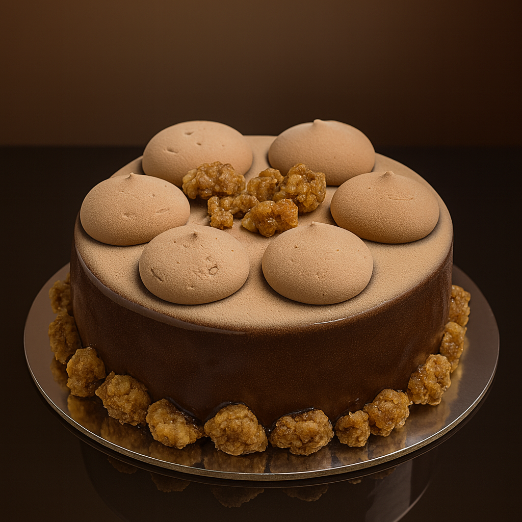 A tender honey-walnut sponge forms the foundation, layered with molasses-infused milk chocolate mousse and a silken spiced caramel cream. Between the layers, caramelised walnuts shimmer like amber, adding depth and texture.